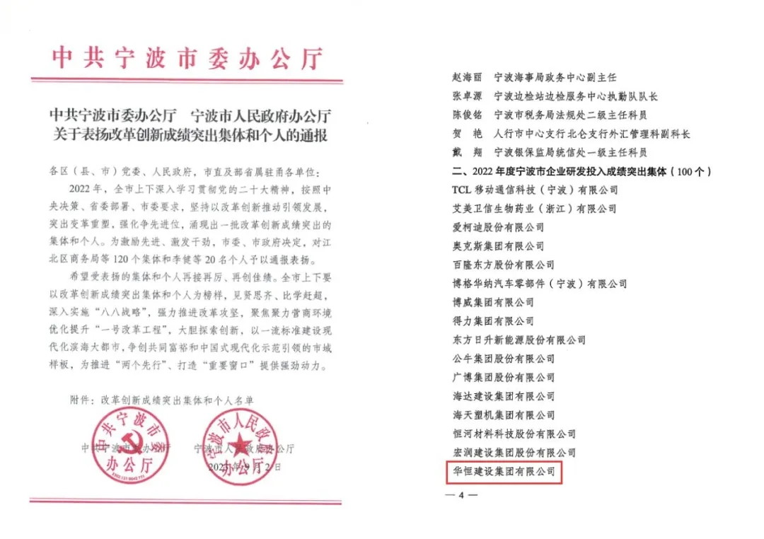 近日,中共寧波市委辦公室、寧波市人民政府辦公廳發(fā)來表彰文件《關(guān)于表揚(yáng)改革創(chuàng)新成績突出集體和個(gè)人的通報(bào)》,公司被授予“年度寧波市企業(yè)研發(fā)投入成績突出集體”稱號。